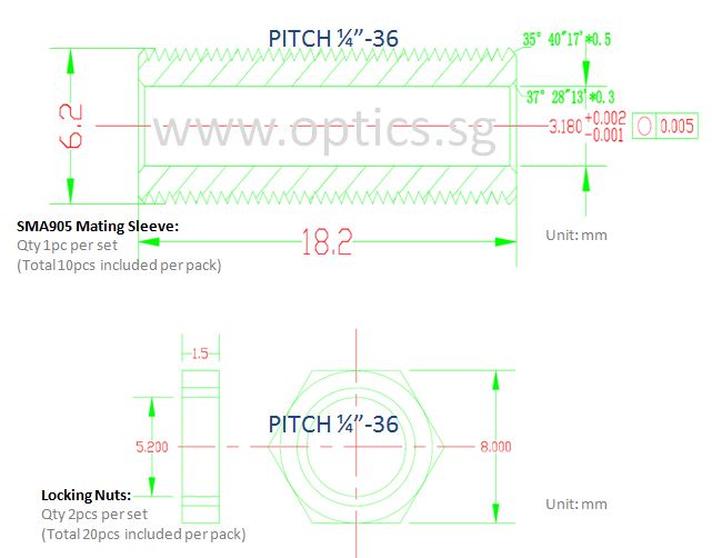 Pitch design per ¼"-36 standard SMA905, as drawing below |