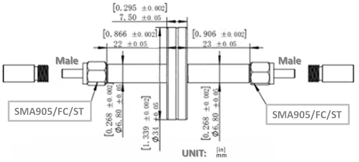 Fiber Feedthrough allows for optical coupling into Ultra High Vacuum (UHV) systems down to 10^-10 Torr. These are fixed (non-rotating) flanges with male FC or SMA905 fiber connectors on both sides. Mating sleeves may be used to connect fiber patch cables to the feedthrough; These flanges have six through holes to bolt onto any standard DIA2.75-inch CF flange with typical 1/4inch-28 bolts (mounting hardware is not included). The feedthrough has an insertion loss and can handle up to 10W of laser power. A glass-ceramic seal holds the hermetically-sealed fiber in place and forms the leak-tight seal. The CF style flange utilizes a knife-edge mechanism to create an airtight seal between mating pieces. To accomplish the seal, a copper gasket is most often employed. As the bolts of the mating pair are tightened, the knife edge ?°bites?± into the copper gasket, deforming it. The extruded metal fills all the machining marks and surface defects, which yields a leak-tight seal. |